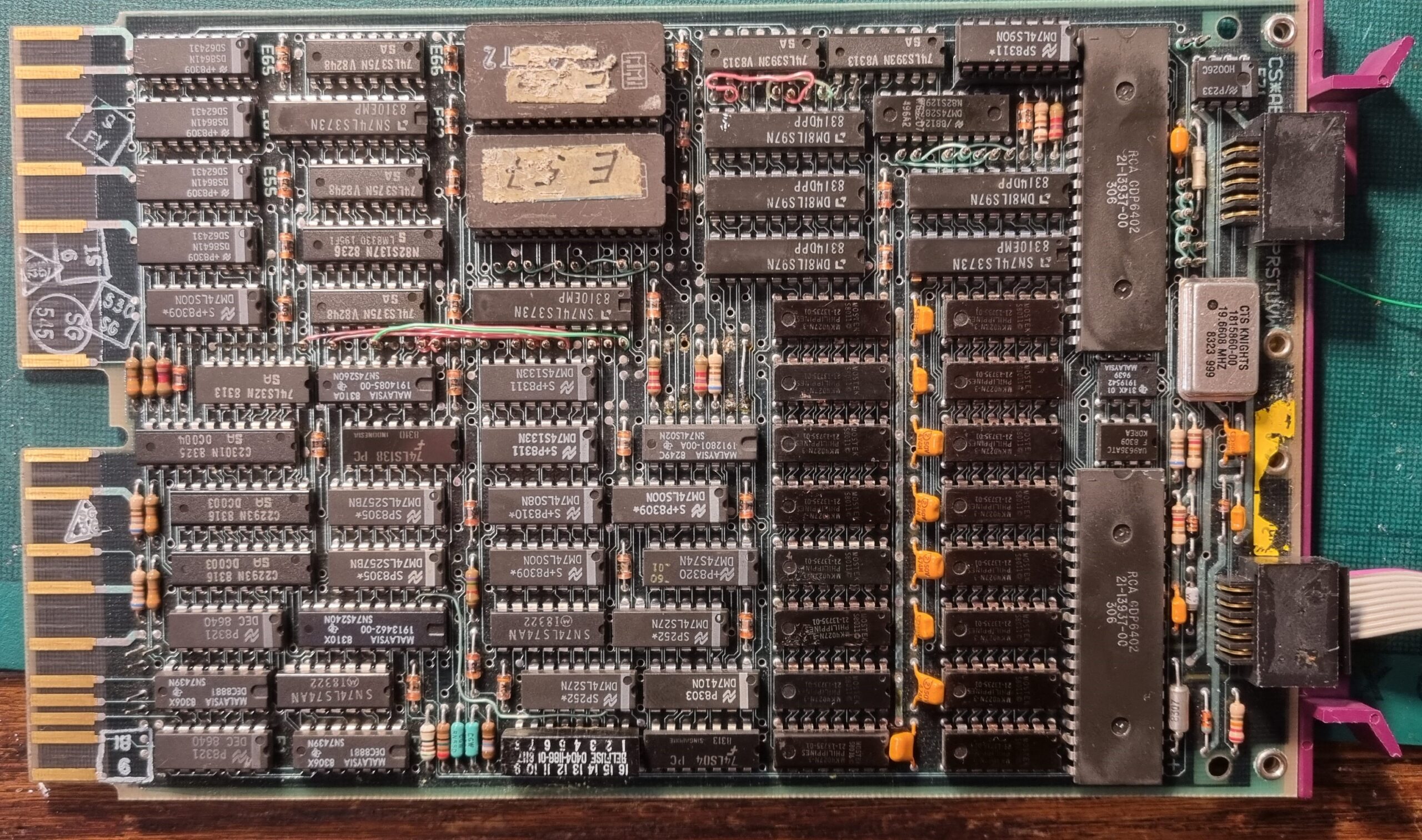 MK38P70 + M2764 – keistas sprendimas: mikrokontroleris ir ant kupros (piggyback) EPROMAS. Tai ST eksperimentai. Galvoju, kad toks korpusas buvo labai brangus. Beja EPROM viduje matosi irgi papildomas čipas (diodas?).