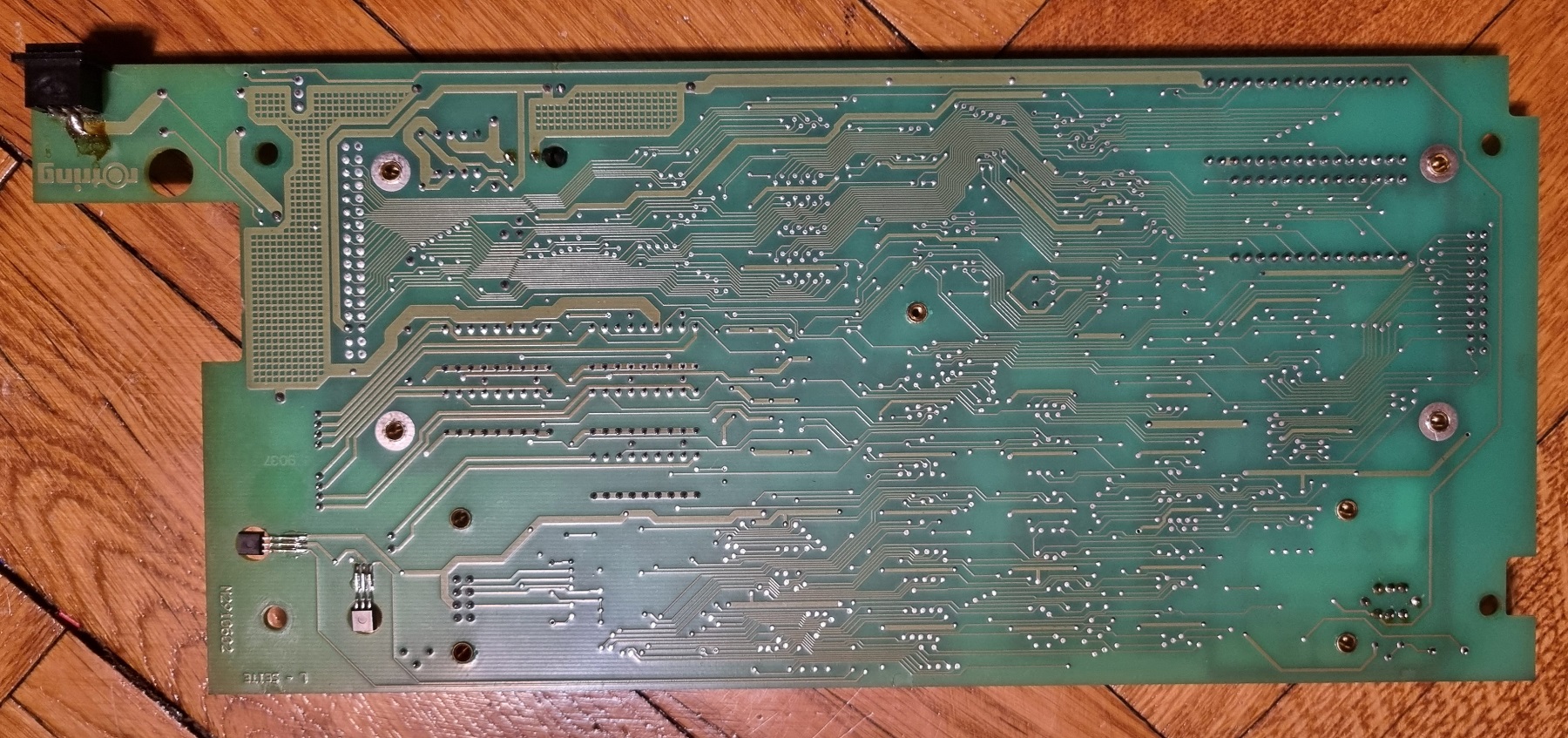 Galvoju šiandien, kaip aš sujungsiu tas plokštes- aš gi Q-Bus backplane neturiu. Nueinu apie 16:00 į elektronikos sandėlį ir žiūrau… bl… panašu, kad guli gal ir PDP11 backpleinas. Pakėliau- surudijęs, sulankstytas, kažkoks ne PDP. Bet kištukų kiekis atitinka. Pasidėjau į slaptavietę. Žiūrau sau į tą kalną plokščių, jei yra backpleinas, tai gal kokia plokštelė atsiras. Radau kažkokia, analoginę lyg ir panaši, bet auksiniai kontaktai nukirpti. Dar pakuičiau ir net širdis sustojo. Va: