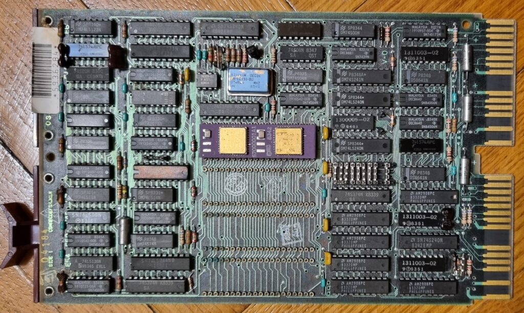Tai silpnesio modelio PDP-11/23 procesoriaus plokštė su F-11 čipsetu. 18 bitų adresacija, be MMU (vadinasi mažai RAM), be FPU. Bet ALU dalis lygtai yra. Buvo baisi, išploviau su muilu, distiliuotu vandeniu ir izopropilo alkoholiu.