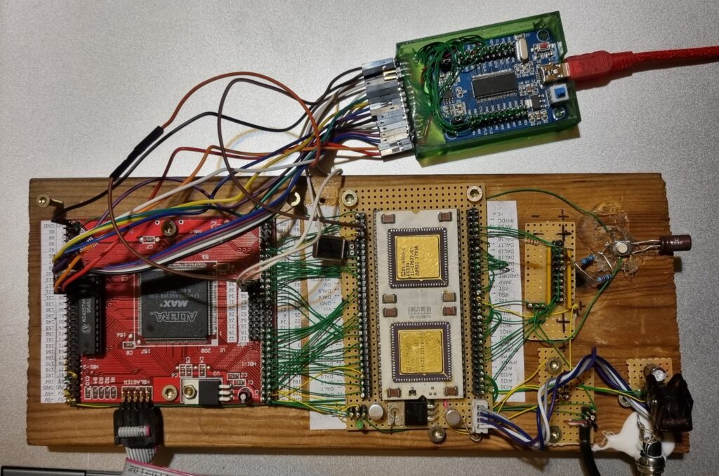 Čia mano eksperimentinė plokštė. Alteros CPLD sukonstravau šiokį tokį CPU “aprišimą” ir teoriškai jis turėjo paleisti mano mikro programą ar pasileisti į amžiną “NOP” ciklą. Tačiau procesorius pyktybiškai daro savo darbą ir iššoka į debug konsolę – ODT. Kas tai yr? Ogi tai monitoriaus “programa” leidžianti serial terminalo pagalba redaguoti atmintį, paleisti programas ir ką nors dar. Toks daiGtas kaip WozMon pas Apple 1 kompiuterį. Tik čia ne softas, o pačio CPU silikone, mikrokode parašytas softas. Kad jis veiktu nereikia nei atminties, nei kokio ROM. Reikia tik specifinės UART mikroschemos ir kelių mikroschemų. Į debug režimą galima papulti kai lūžta procesorius, HALT komanda arba “blinken lights” mygtukais.