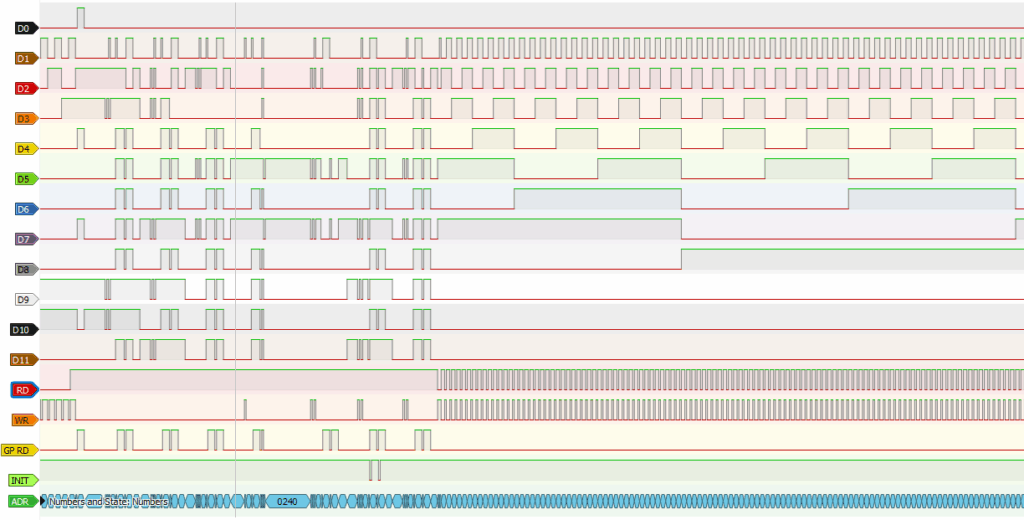O čia kas kažkelintą kartą pasirodo kažkas įdomiau. Kogero taip veikia mano programa, kuri pabėga iš savo ciklo ir užsišoka ant NOP komandos. Ko pasekoje CPU adresas didėja ir tas labai gerai matosi ant dekoduotos (pas šiuos CPU adresas ir data yra multipleksuojamos per tas pačias kojas) adresų šynos. Čia 16 bitų procesorius ir jo NOP komanda yra 2 baitų ilgio. Todėl A0 (čia D0) nesikeičia. Keistokai atrodo WR lygis (beja, pas šį prociką nėra nei RD nei WR kojyčių. Čia irgi reikia dekoduoti). Bet šis režimas nestabiliai pasileidžia. Nu nėra mano procesorius stabilus.