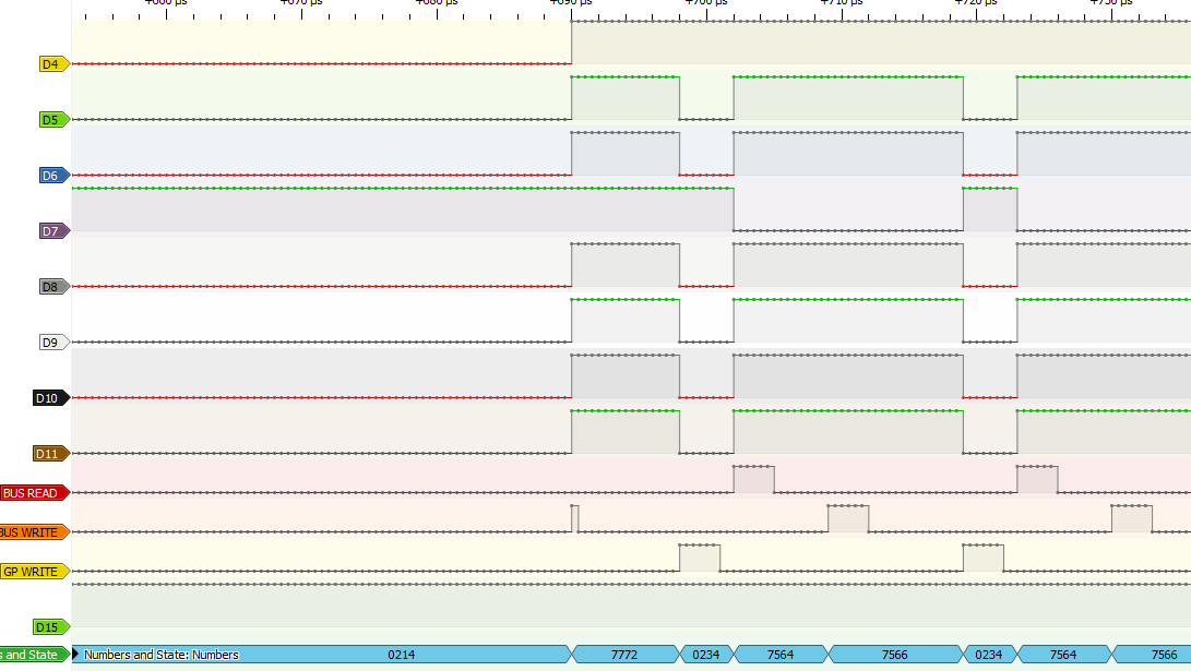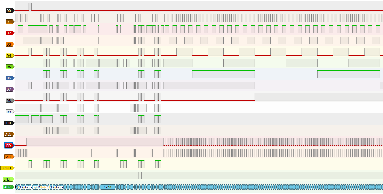 O čia kas kažkelintą kartą pasirodo kažkas įdomiau. Kogero taip veikia mano programa, kuri pabėga iš savo ciklo ir užsišoka ant NOP komandos. Ko pasekoje CPU adresas didėja ir tas labai gerai matosi ant dekoduotos (pas šiuos CPU adresas ir data yra multipleksuojamos per tas pačias kojas) adresų šynos. Čia 16 bitų procesorius ir jo NOP komanda yra 2 baitų ilgio. Todėl A0 (čia D0) nesikeičia. Keistokai atrodo WR lygis (beja, pas šį prociką nėra nei RD nei WR kojyčių. Čia irgi reikia dekoduoti). Bet šis režimas nestabiliai pasileidžia. Nu nėra mano procesorius stabilus.