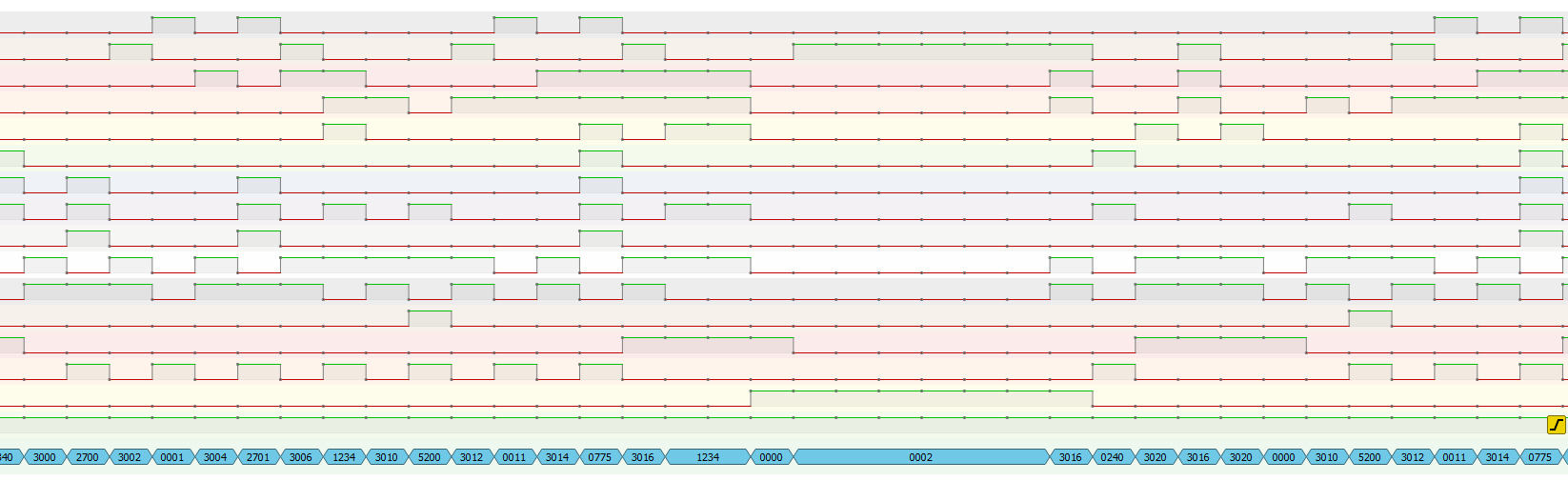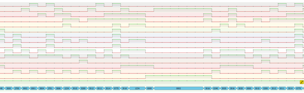 Pas mane nėra nei blinkenlights, nei UART konsolės. Todėl teko panaudoti logini analizatorių. Gaunasi maždaug taip: